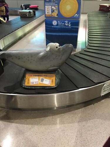 帰北しました。これは旭川空港の荷物ベルトコンベアー。旭山動物園のごまふあざらし親子がいます。