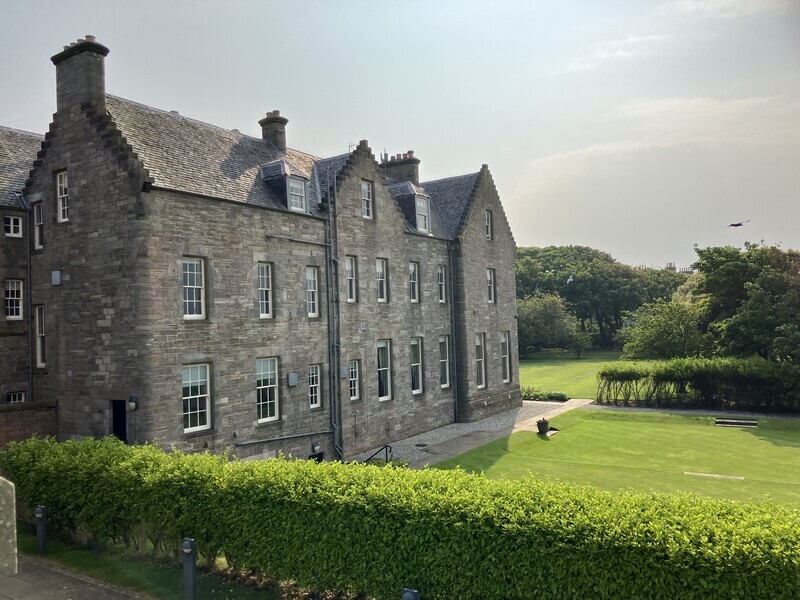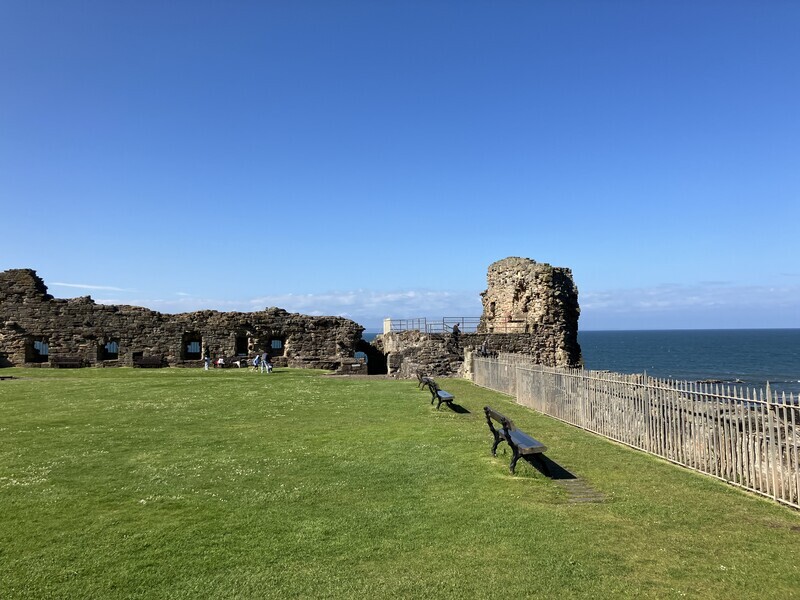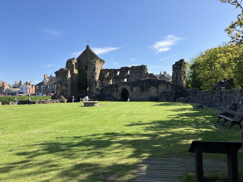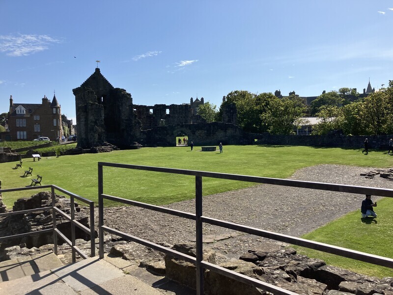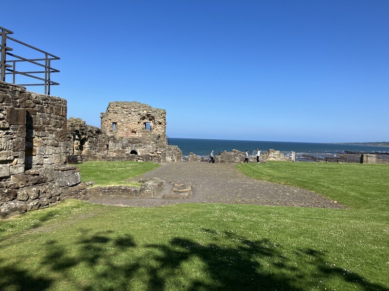 2024-06-03 セントアンドルーズ(3)セントアンドルーズ城 旅 学会2日目は16時で終了したので、セントアンドルーズ城に行ってきた。ここも大聖堂同様遺構で、建物は完全に残っていない。小さなビジターセンターに簡単なお城の説明パネル展示があり、あとは屋外の お天気がいい。 海がかなり近い。 ここは狭くて危険らしいので入らなかった。 記念写真 地下牢遺構。